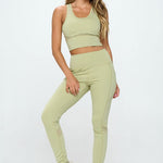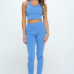 Work out in style with this two piece activewear set that comes with a banded sports bra and matching high-rise leggings with cut-out detail on the back, It's the perfect set for any workout.