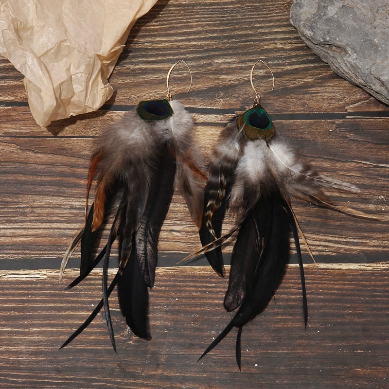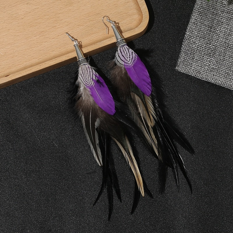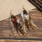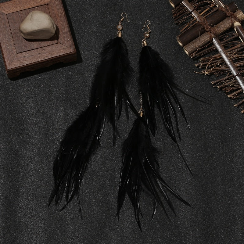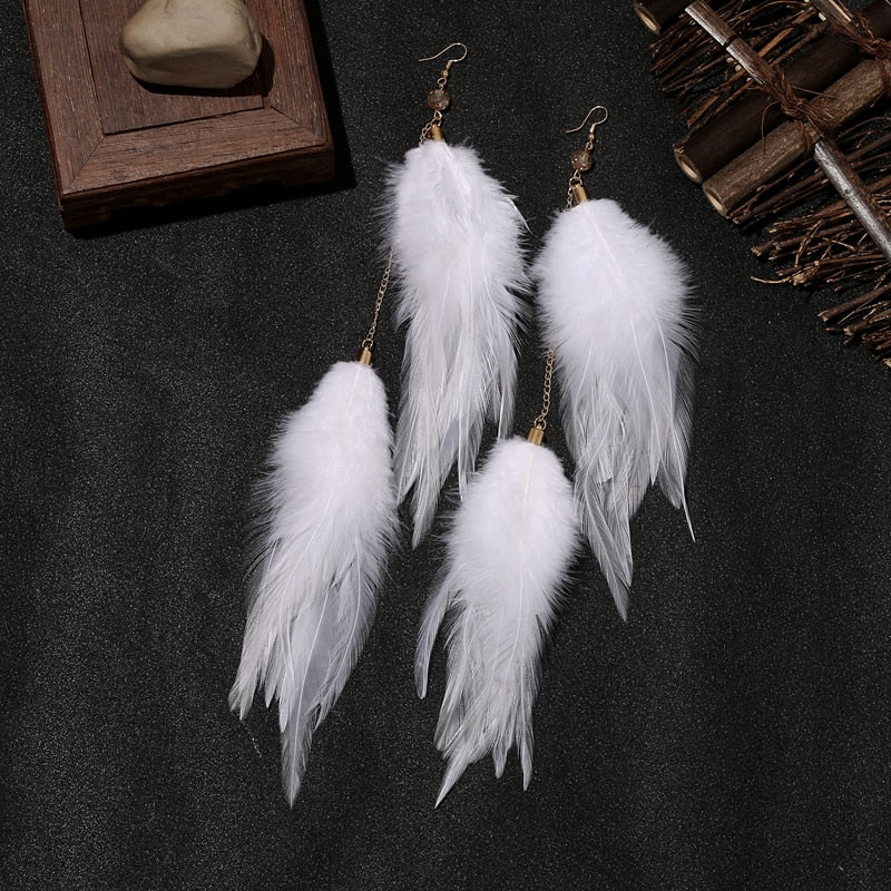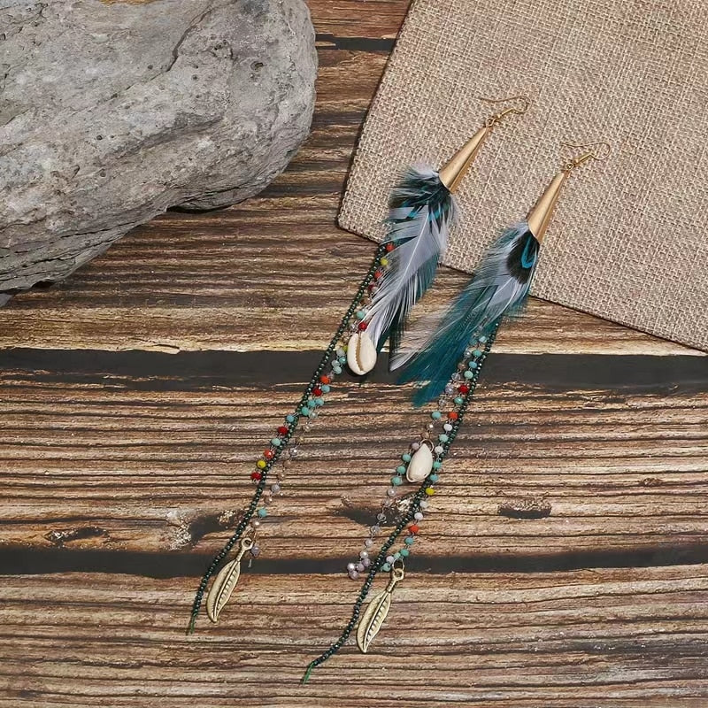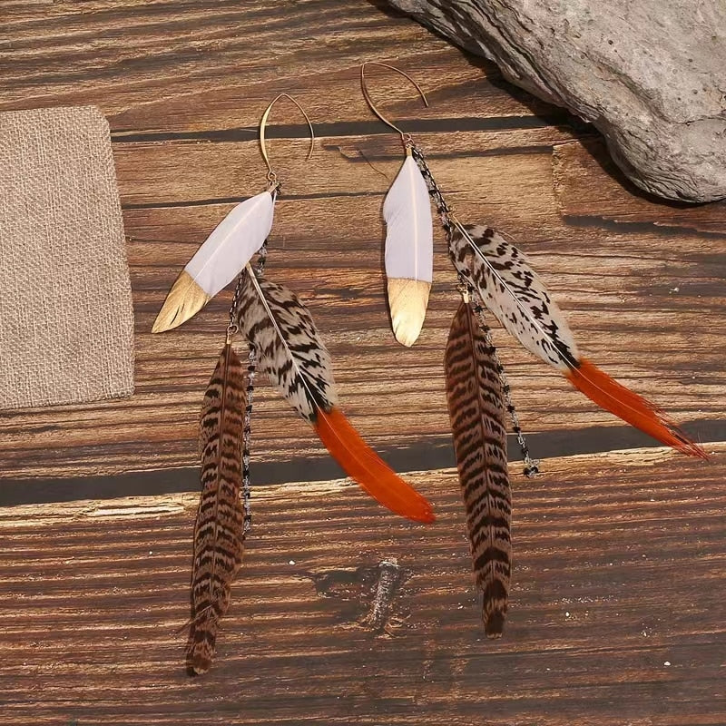 Add a touch of boho glam to your ensemble with these beautiful feather earrings. These eye-catching earrings are perfect for dressing up any outfit. With their intricate design and dainty chain tassels, they're sure to add a touch of luxury to your look. Wear them to your next special event or wear them every day for a touch of glamor.