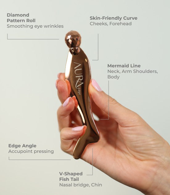 Use Aura Edge Roller back and forth under your eyes, temples, cheeks, and jawline.