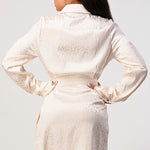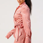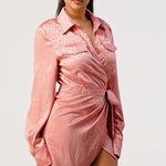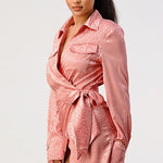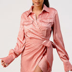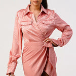 Step out in style with this leopard print wrap double pocket shirt dress. This luxurious satin fabric dress features a waist tie front, long sleeves and is imported for quality craftsmanship. Choose from two colors - pink or white - for a distinctive twist on this timeless style.