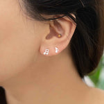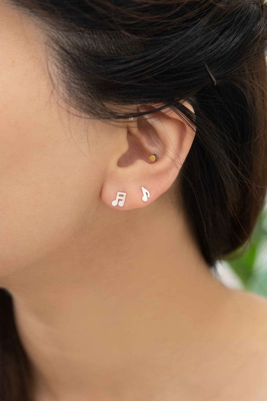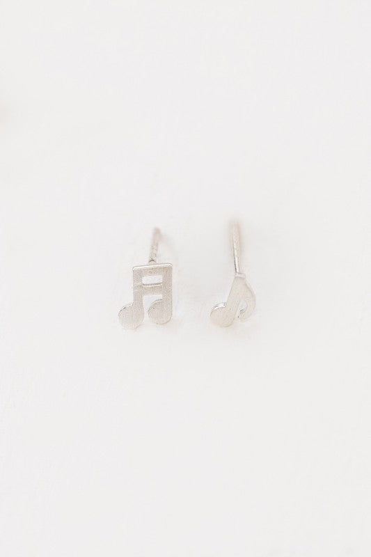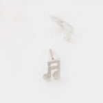 Dainty, sterling silver musical note stud earrings. Asymmetrical earrings with one eighth note and two sixteenth notes.