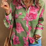 Blossom in style with our Rosy Flower Collared Neck Long Sleeve Shirt! This delightful piece radiates charm with its all-over floral print, adding a burst of freshness to your look.