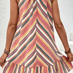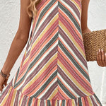 Step into a world of color with our Sierra Dress, This vibrant, sleeveless dress features bold, multi-directional stripes in a spectrum of warm hues, making it a standout choice for any sunny day outing. The halter neck design adds a touch of sophistication while emphasizing the shoulders, and the playful ruffled hemline gives the dress a flirty, breezy feel.