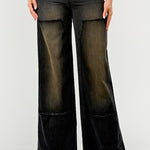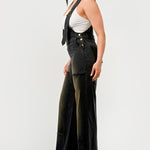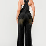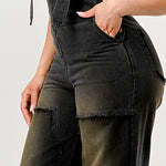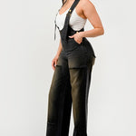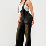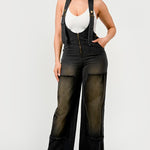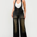 These overalls feature a sleek, fitted bodice that transitions into a relaxed leg silhouette, offering a modern twist on a classic staple. The rich, dark wash denim is accented with subtle fading and whiskering, lending an edgy yet sophisticated look. Functional elements include a front zipper closure, adjustable straps with metallic hardware, and ample pocket space with side, back, and chest compartments. The frayed hem adds a touch of urban ruggedness, making it a versatile piece for street-inspired fashion or casual outings.