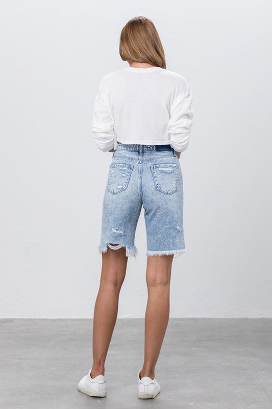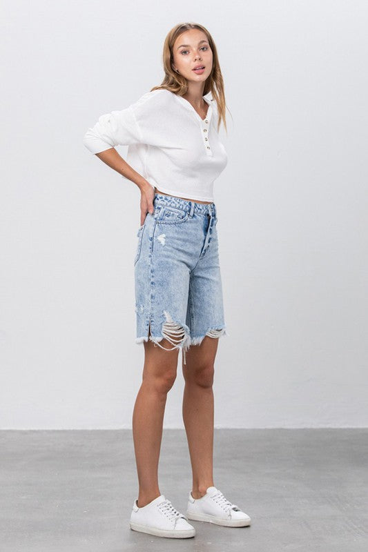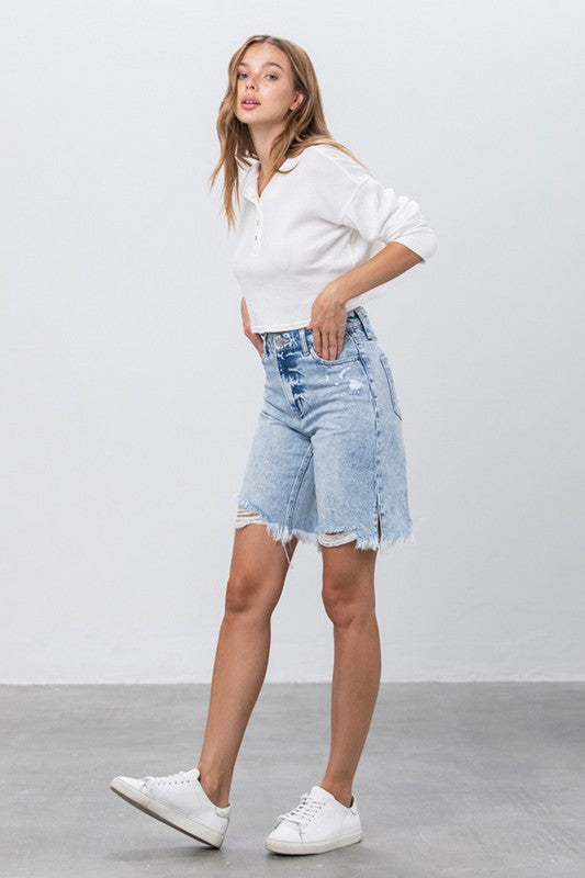 TAKE NO SLIT DISTRESSED DENIM BERMUDA SHORTS