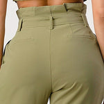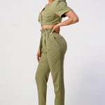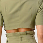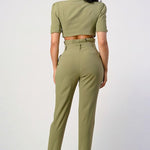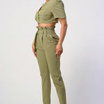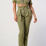 This two-piece set comes in an olive hue and features a half sleeve crop top with a hook-eye closure and a waist belt. It is complemented by the high-waisted ruffle pants with a comfortable fit. Imported and made of high quality materials, this set is perfect for any busy day in the office.