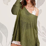 Oversized stretchy sweater top with v-neckline with drop shoulders and long sleeves, reverse stitching top.
