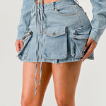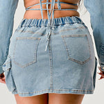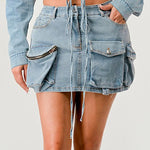Revamp your denim collection with our Denim Daze Wrap Skirt. This unique skirt showcases a modern wrap design with adjustable drawstrings for a custom fit, complemented by a statement side pocket with zipper detail. It's a fresh take on a classic denim look, perfect for trendsetters