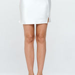 Made in USA Solid Satin Mini Skirt with Slit. Available in other Colors. Fabric content: 97% Polyester, 3% Spandex.