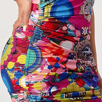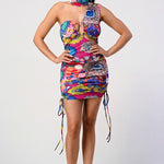 This Multi Printed One Shoulder Mini Dress has a unique style that will flatter any body type. It is made with a multi-colored fabric and features a one-shoulder design, a mock neck, ruched sides, and a cut-out. Perfect for any stylish occasion!