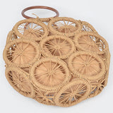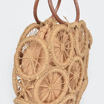 Natural raffia woven circle handbag with wooden ring handles and sunburst pattern—neutral beach tote
