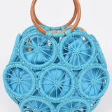 Ocean-blue raffia sunburst circle tote with wooden round handles—statement woven beach bag.
