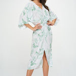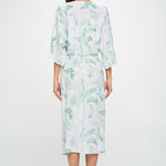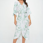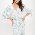 Made in USA Tencel Tropical Leaf Print Kimono Style Dress with Front Twist. Fabric content: 100% Tencel.