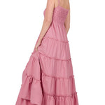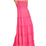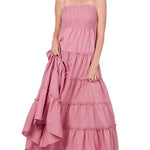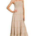The Woven Smocked Top Tiered Cami Maxi Dress is the epitome of effortless summer style. This dress features a smocked top with adjustable spaghetti straps, ensuring a comfortable and secure fit. The tiered cami design adds a touch of whimsy and movement to the silhouette, making it perfect for beach days or casual outings.