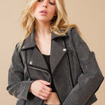 The Crystal Studded Stretch Zip Up Moto Jacket is a stunning and edgy fashion statement that adds a touch of glam to your wardrobe. Its stretchy fabric ensures a comfortable and flattering fit, while the crystal studded detailing brings a bold and unique element to the classic moto jacket design. This jacket is perfect for those looking to make a fashion-forward statement with a hint of rock 'n' roll chic.