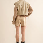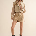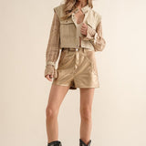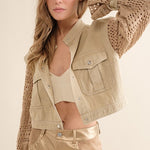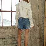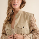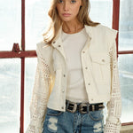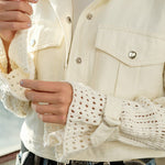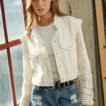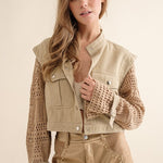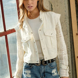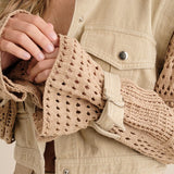 The Twill Crop Crochet Sleeve Jacket is a chic and versatile outerwear piece perfect for adding a stylish layer to your outfits. Crafted from twill fabric, this jacket features a cropped length for a contemporary look. The crochet sleeves add a touch of texture and femininity, while the buckle tie snap-up closure adds a unique detail to the front.