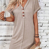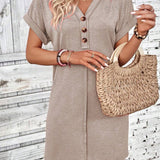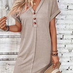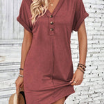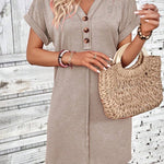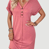 Introducing our Quarter Button V-Neck Short Sleeve Dress! This versatile dress features a stylish quarter button design and a comfortable v-neck cut, perfect for any occasion. With its flattering silhouette and soft fabric, you'll stay effortlessly chic and comfortable all day long. Upgrade your wardrobe with this must-have dress now!
